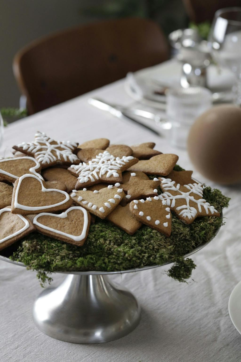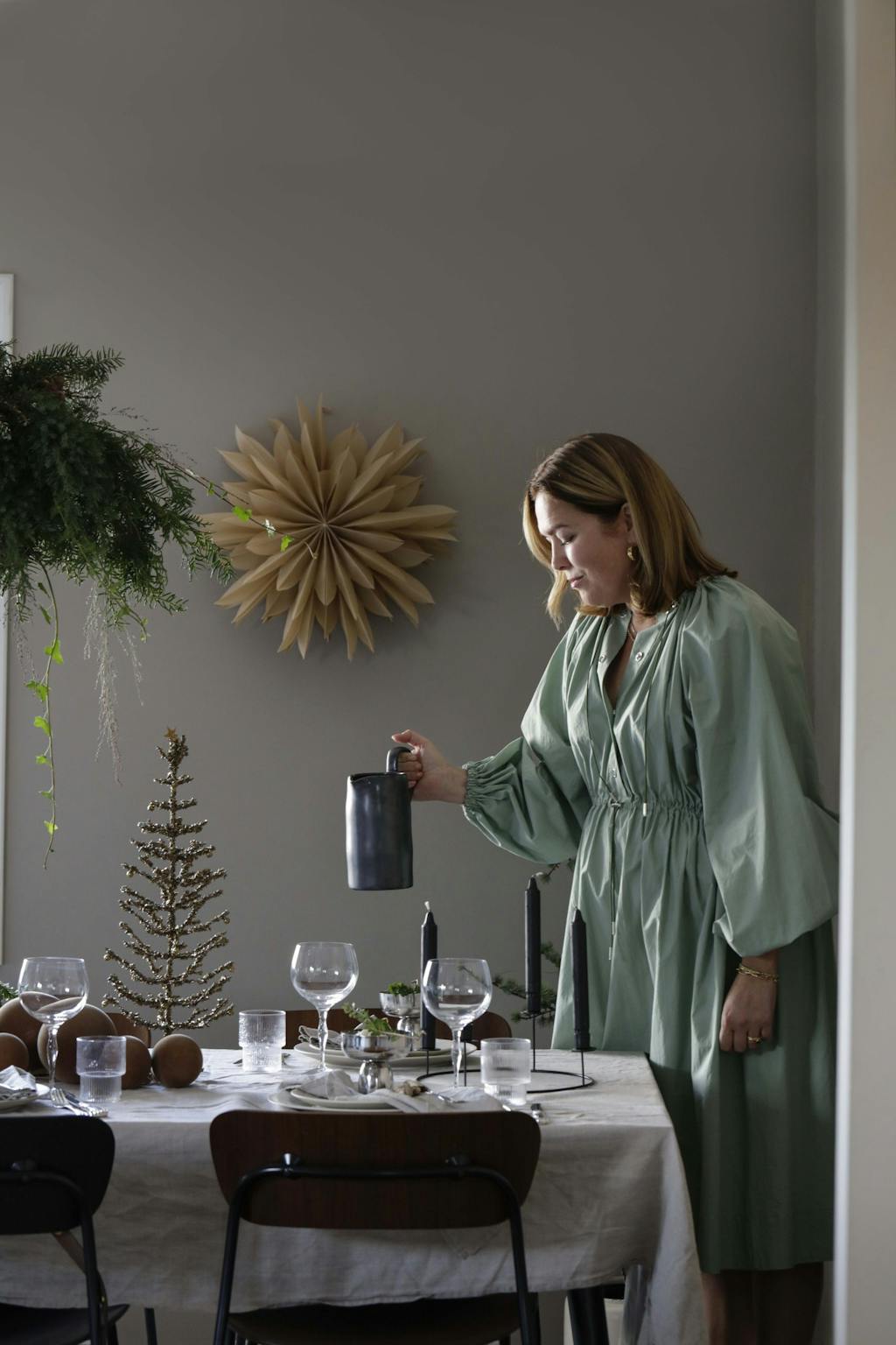 AvGry har eget oransjeri i hagen. Her dyrker hun blomster året rundt som hun deler bilder av på Instagram-kontoen @oransjegry. På bordet er det dekket opp med duk og servietter i lin fra Himla, servise og cocktailglass fra Essei, vinglass fra Orrefors og vannglass fra Ferm Living. Svart adventstake fra House Doctor, juletre i gull fra Walter & Co og mugge fra Ferm Living. Pavillion-stolene er fra &Tradition. På veggen henger en papirstjerne fra Watt & Veke.