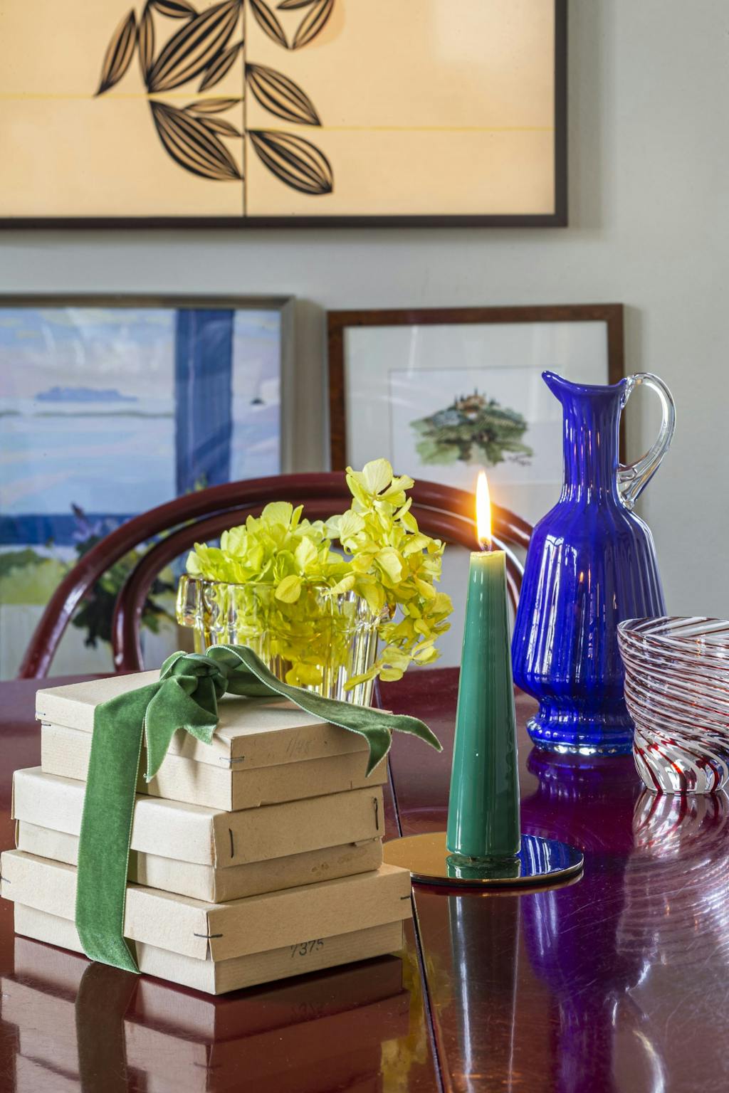 Ida elsker lys i mørketiden og tenner alltid mange stearinlys. De store sølvkulene er funnet hos dekos.dk. De er bundet stramt sammen, og da blir de nesten som en installasjon man kan forme som man vil. Sofaen er fra Bolia, og lampen i taket er fra Murano. Bordet er designet av Sebastian Herkner og er fra Beau Marché, og teppet er funnet på Etsy.
