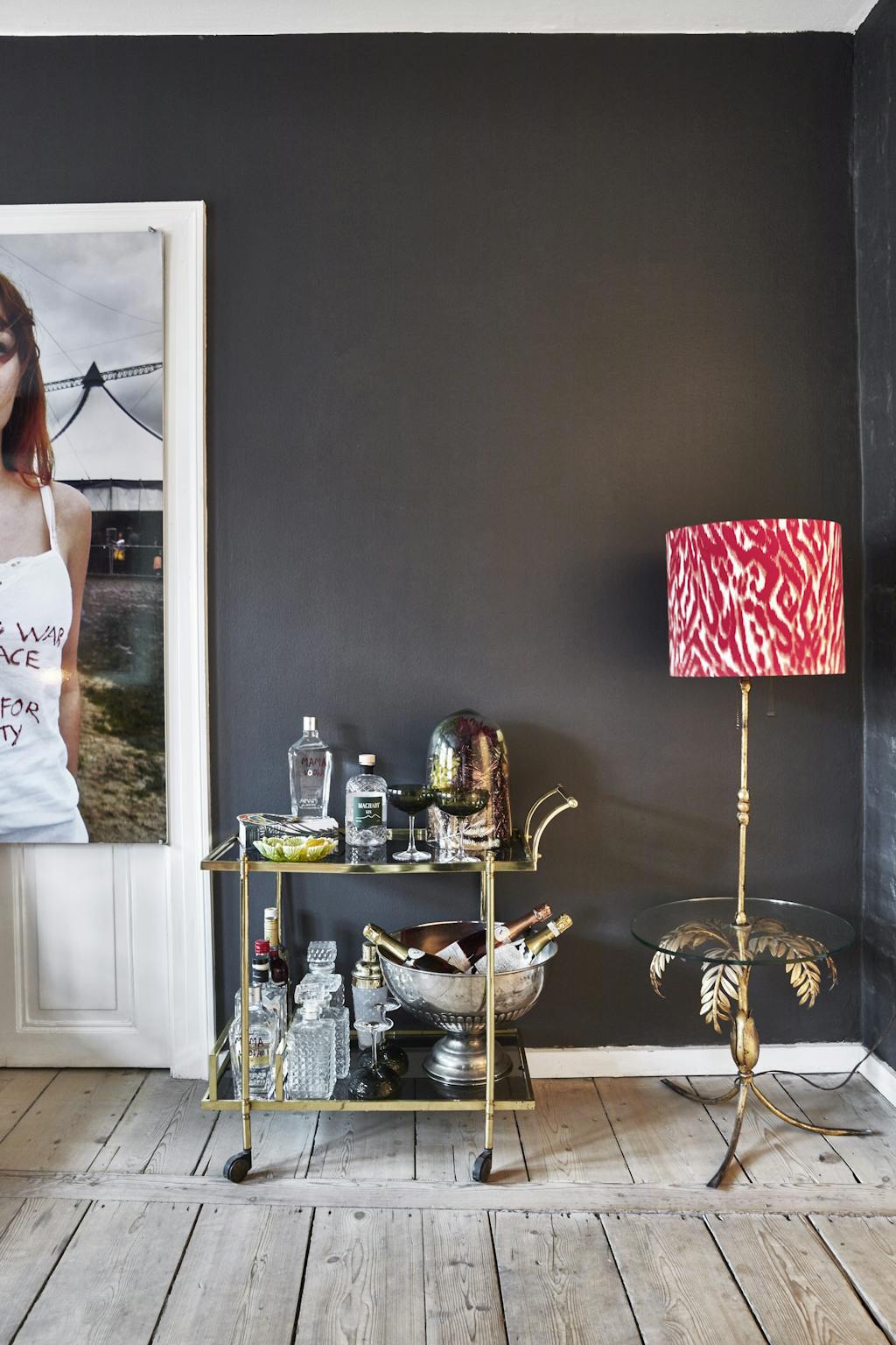Dekoreringen av selve julebordet får en ny vri hvert år, ofte krydret med uventede detaljer. Denne julen har Rikkemai fylt cocktailglass med granbar og rocka ornamenter, mens lysekronen over bordet er pyntet med gjenbrukte grangrener og store, røde lepper.