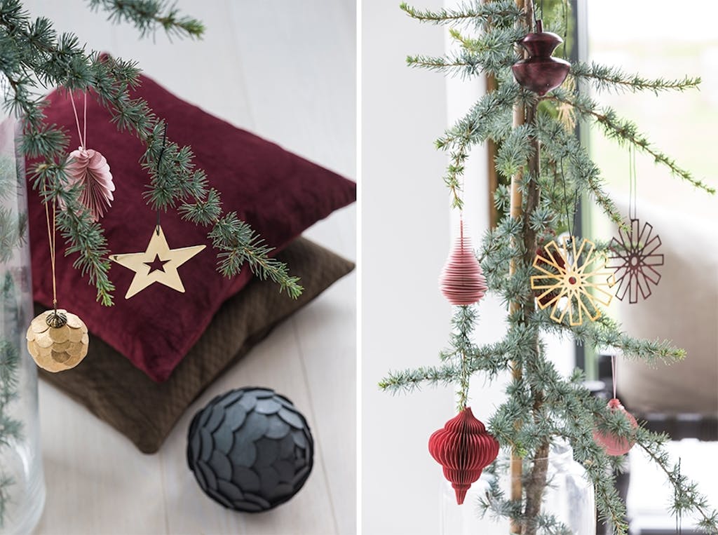 På grenen henger en samling ornamenter fra Georg Jensens julekolleksjon 2016: Sølvkule, 5,4 cm høy, 249 kr per stk., hjerte, H 5,7 cm, 249 kr, bjelle, H 6 cm, 249 kr, Magnolia-uro, H 8,3 cm, 499 kr, og krans, H 5,4 cm, 189 kr.