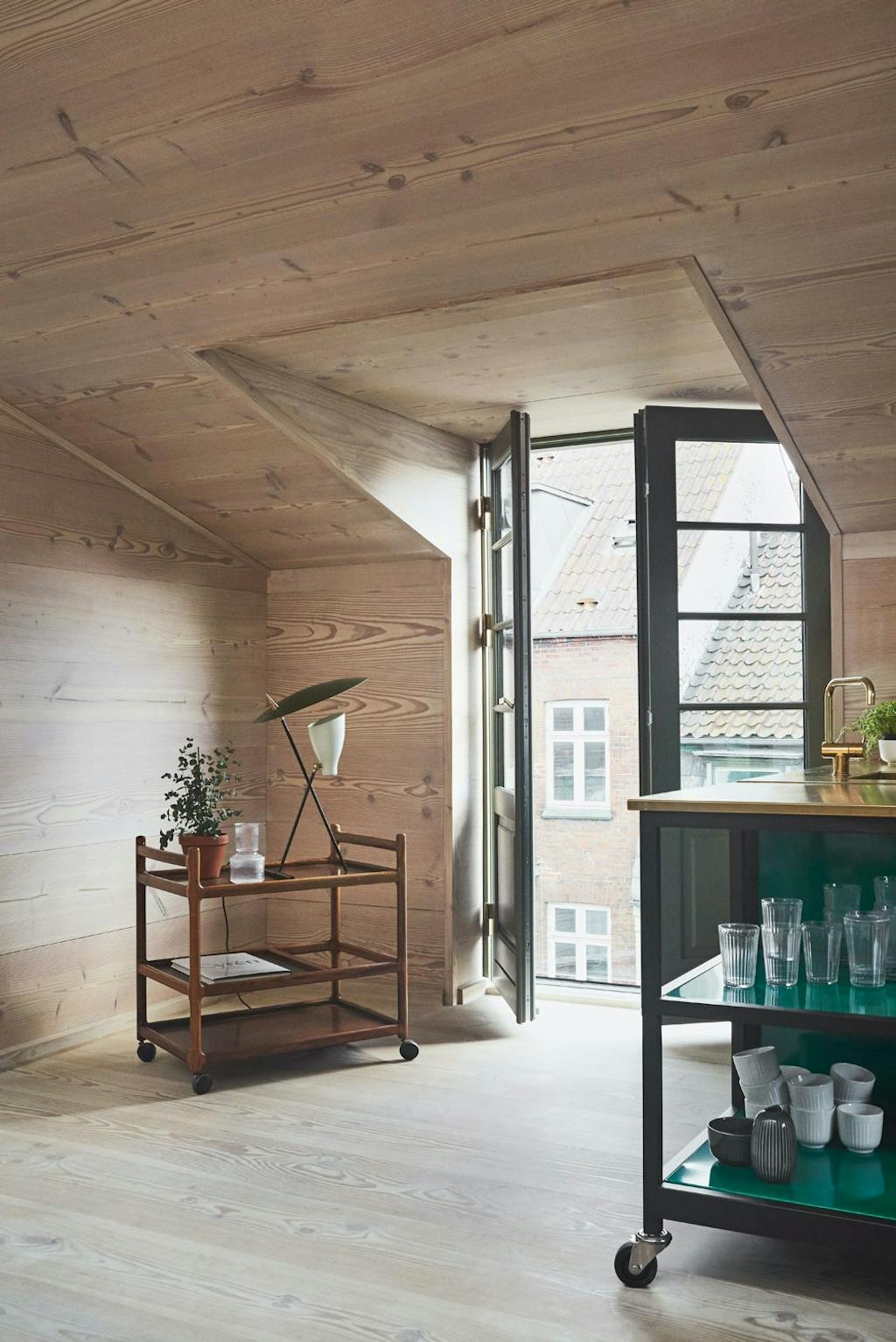 Veggene i det cirka 50 kvadratmeter store kjøkkenet i Århus er kledd i massivt tre fra Dinesen fra topp til tå – en lekker (og ikke helt gratis ...) investering, som gir en helt spesiell varme og atmosfære. Det grønne kjøkkenet fra CPH Square og Boform i lakkert jern og messing er selve fargeklatten i rommet. Og ikke minst, det er mobilt: Modulene på hjul kan enkelt flyttes – etter behov!