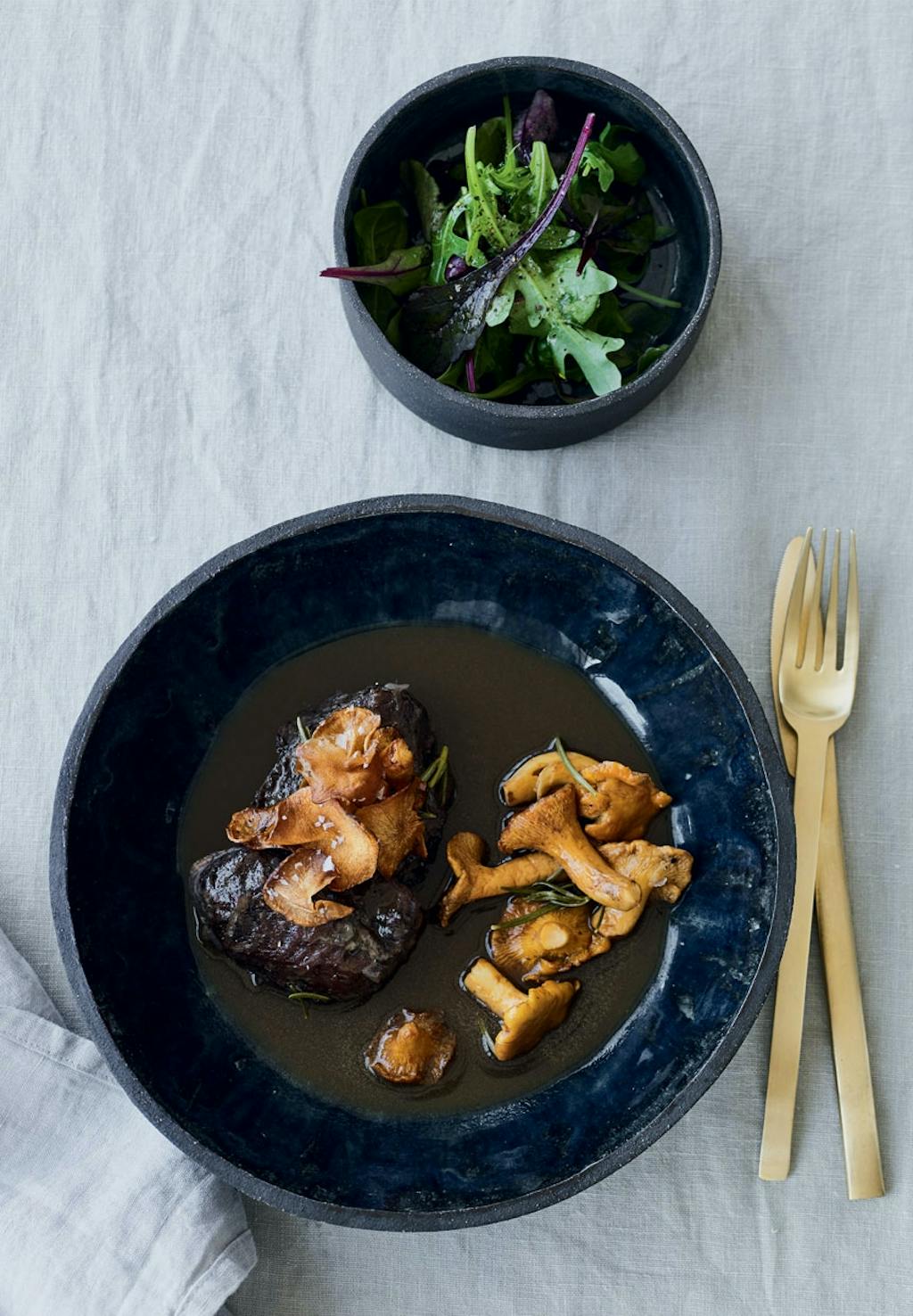 En fantastisk hovedrett som smaker av høst. De braiserte svinekjakene serveres med skogens kantareller og sprø jordskokkchips.