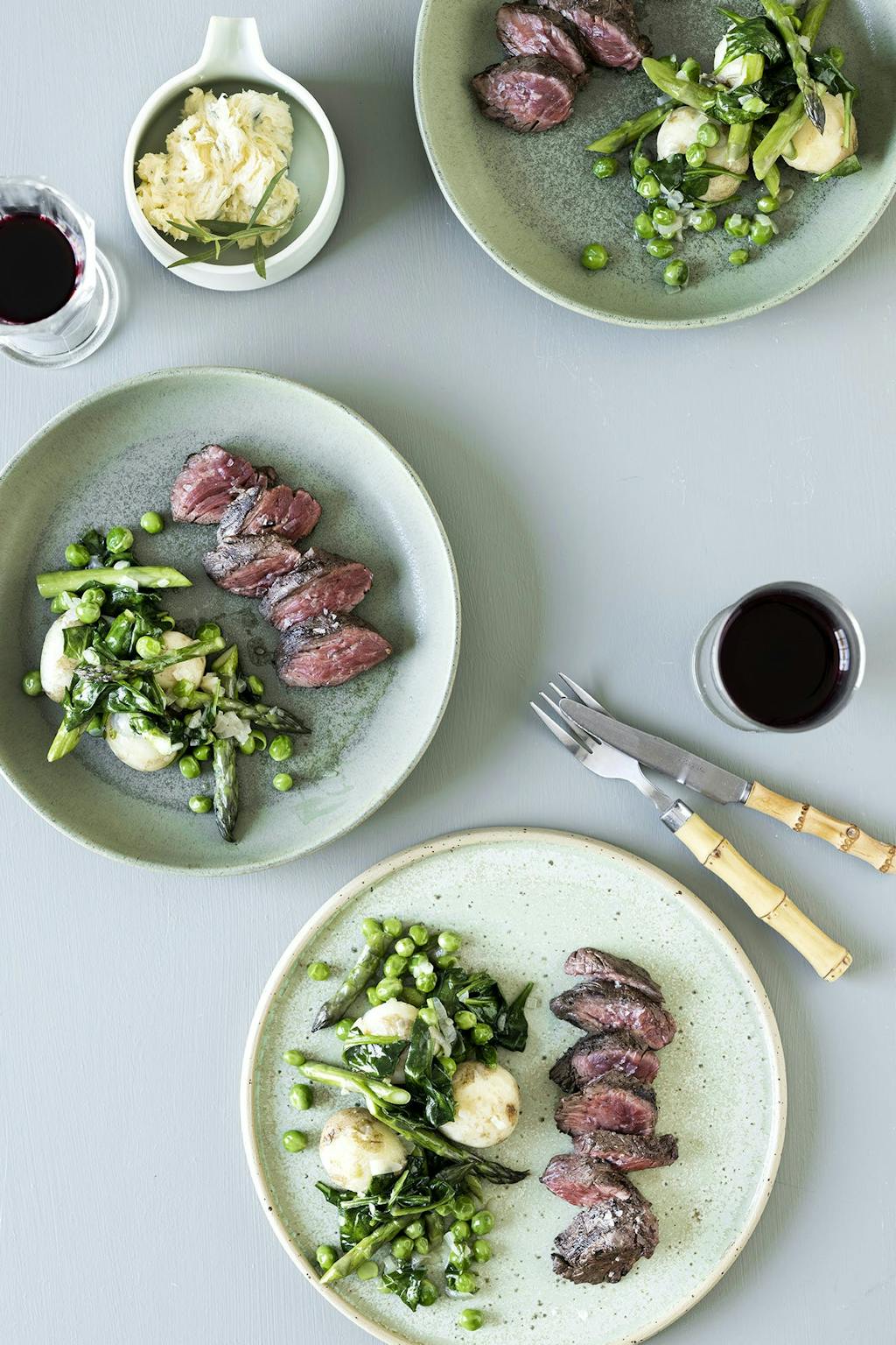 Grillet indrefilet med estragonsmør, franske erter og nypoteter