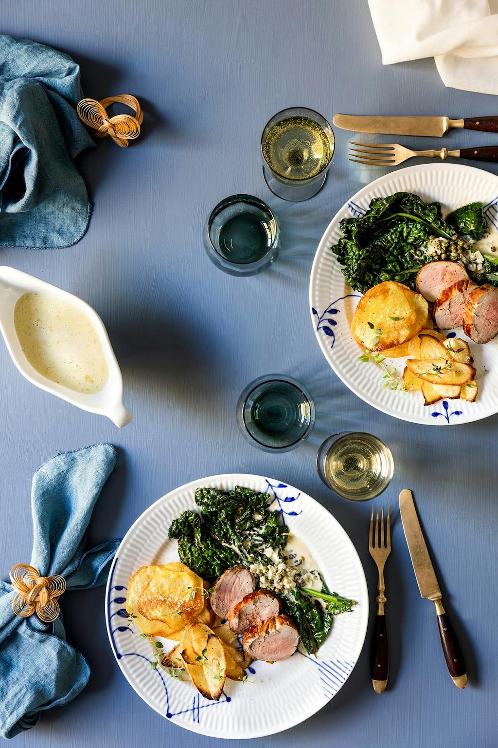 Svinemørbrand med sprø røtter, svartkål og peppersaus