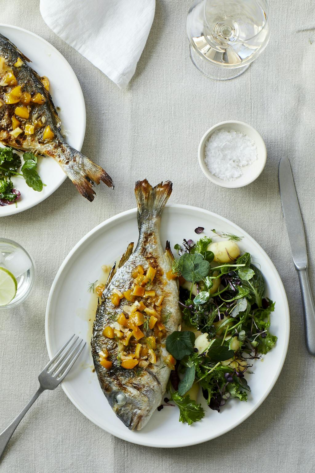 Grillet dorado med ferskensitron-relish, nypoteter og urter